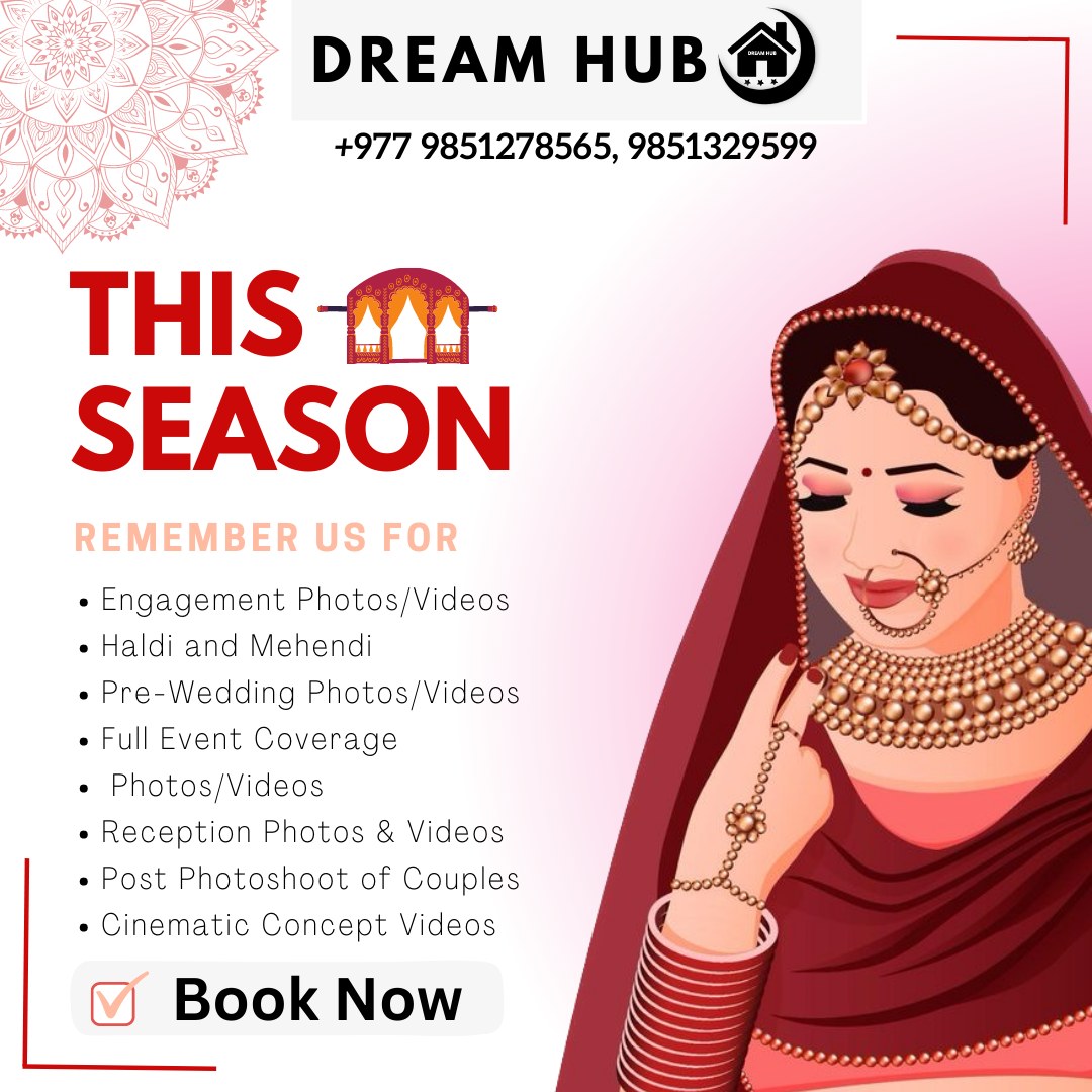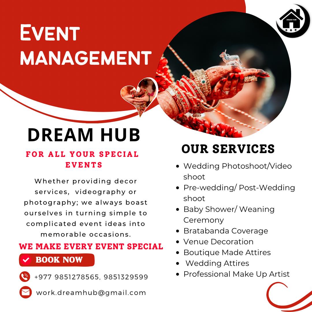 At Dream Hub Pvt. Ltd., we transform your visions into unforgettable experiences. Specializing in event management, we meticulously plan and execute events of all scales, from intimate gatherings to grand celebrations. Our expert team provides comprehensive services including professional photography and videography for weddings, documentaries, and corporate events. We also offer stunning decoration services and create captivating TV commercials. Whatever your need, Dream Hub ensures excellence and creativity, making every moment a cherished memory.